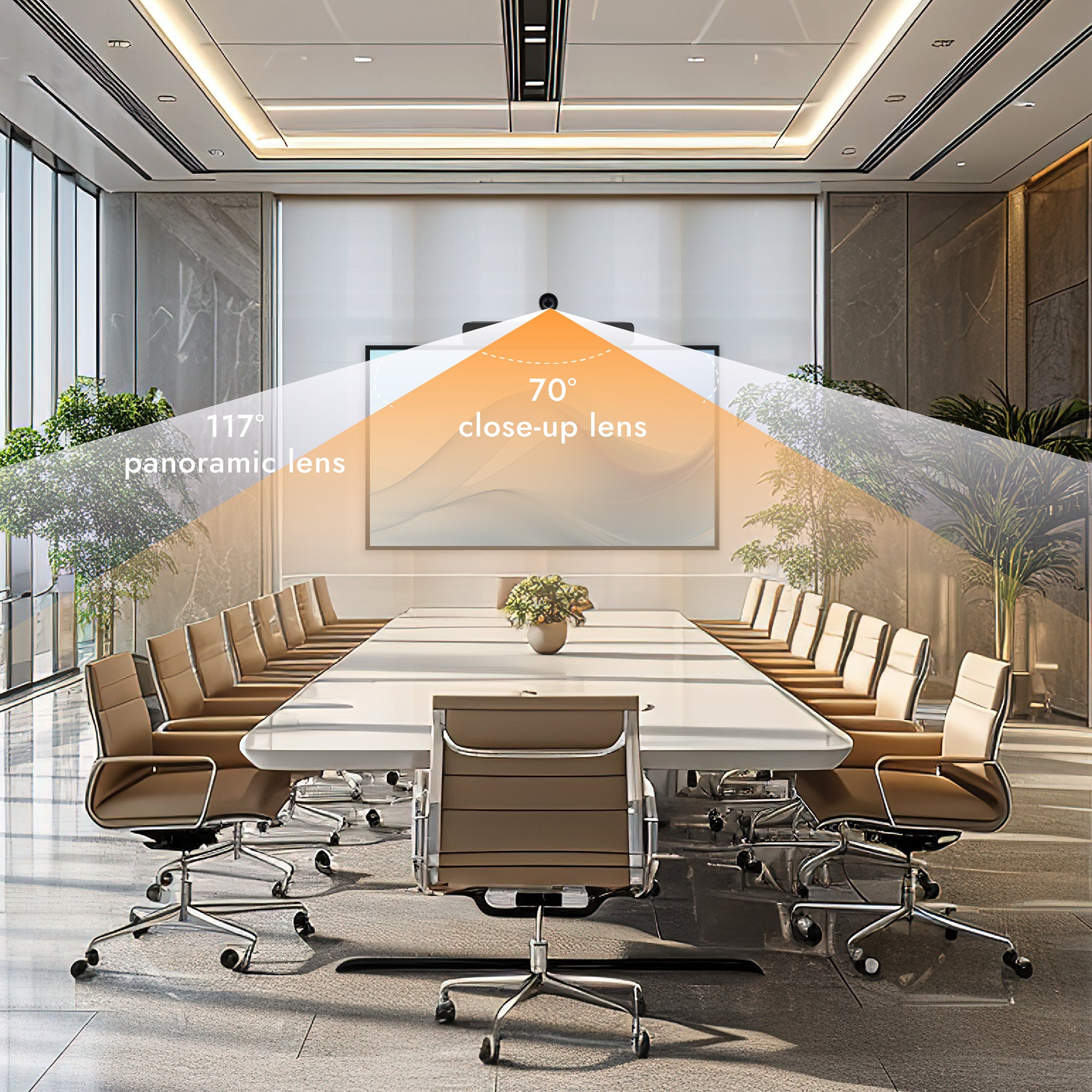 RB20, panoramik ve yakın çekim lensleri 4K UHD CMOS sensörlerle birleştiren çift lens tasarımına sahiptir. Bu, her toplantı için keskin ve ayrıntılı görseller sağlar. Düşük görüntü kalitesi ve sınırlı kapsama alanı gibi yaygın zorlukları çözerek hem tüm odanın hem de bireysel hoparlörlerin net bir görünümünü sağlar.